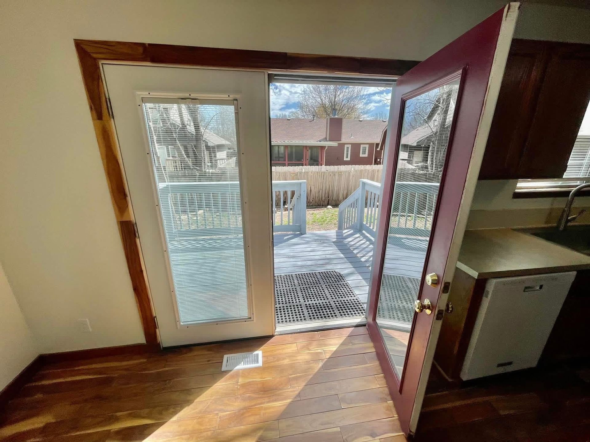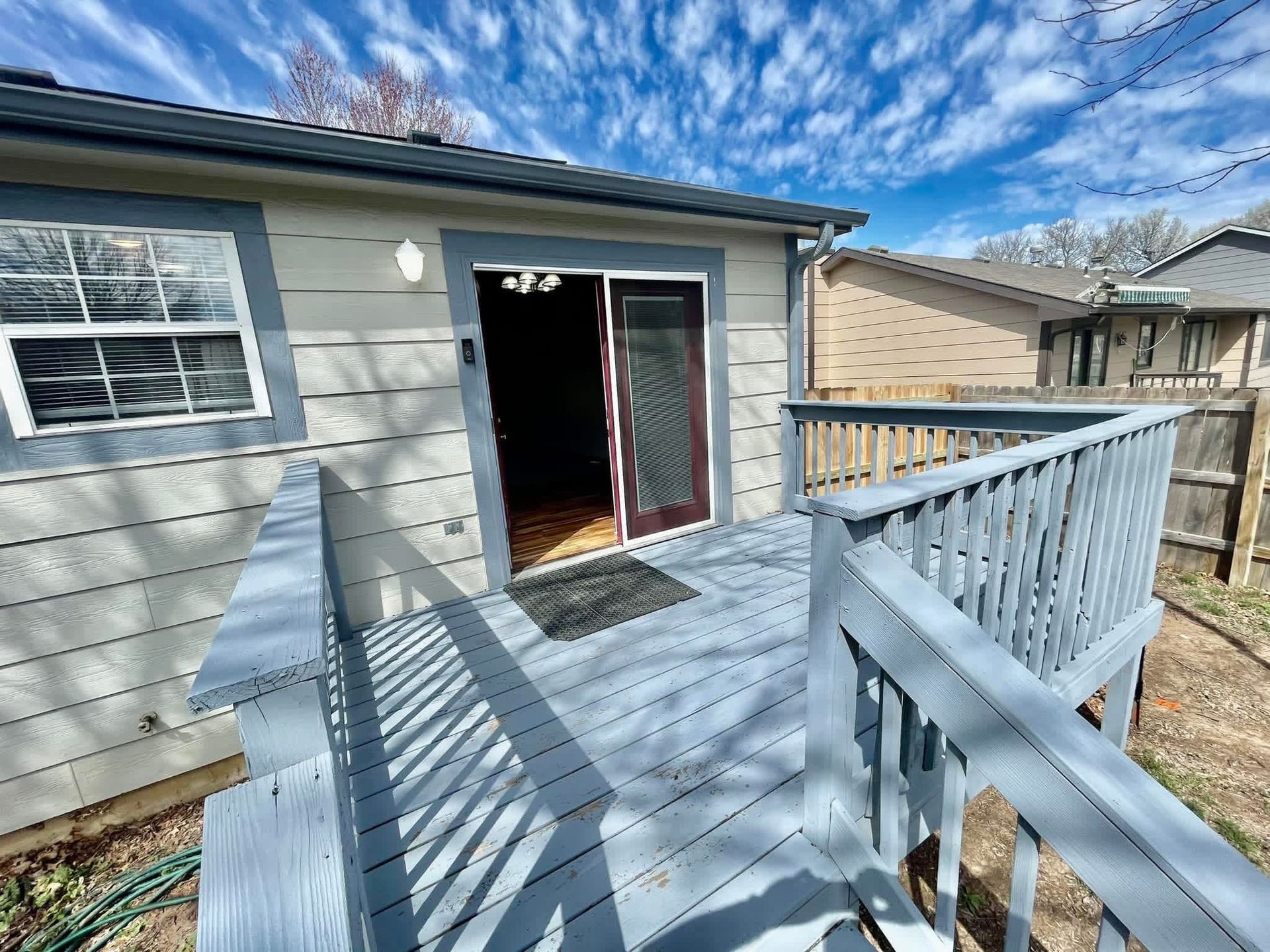 External features: Fenced in backyard with balcony deck.